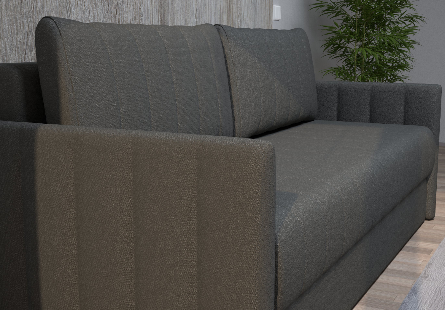 Мягкий и износостойкий велюр приятен на ощупь, а узкие подлокотники делают диван компактным и современным. Внутри — вместительный ящик для белья.
