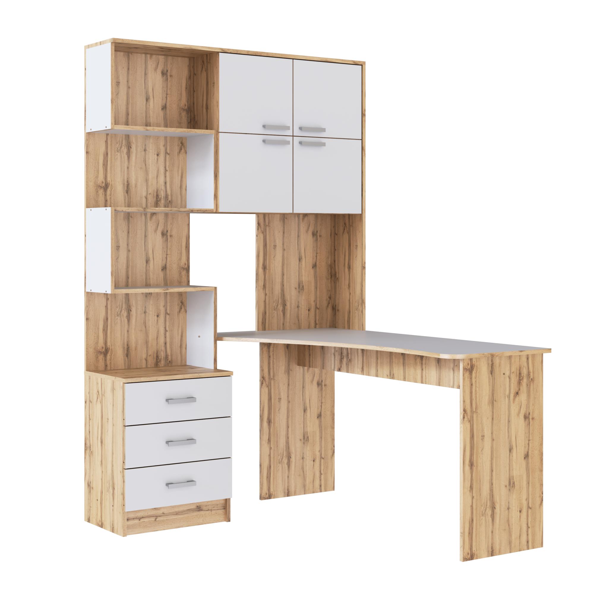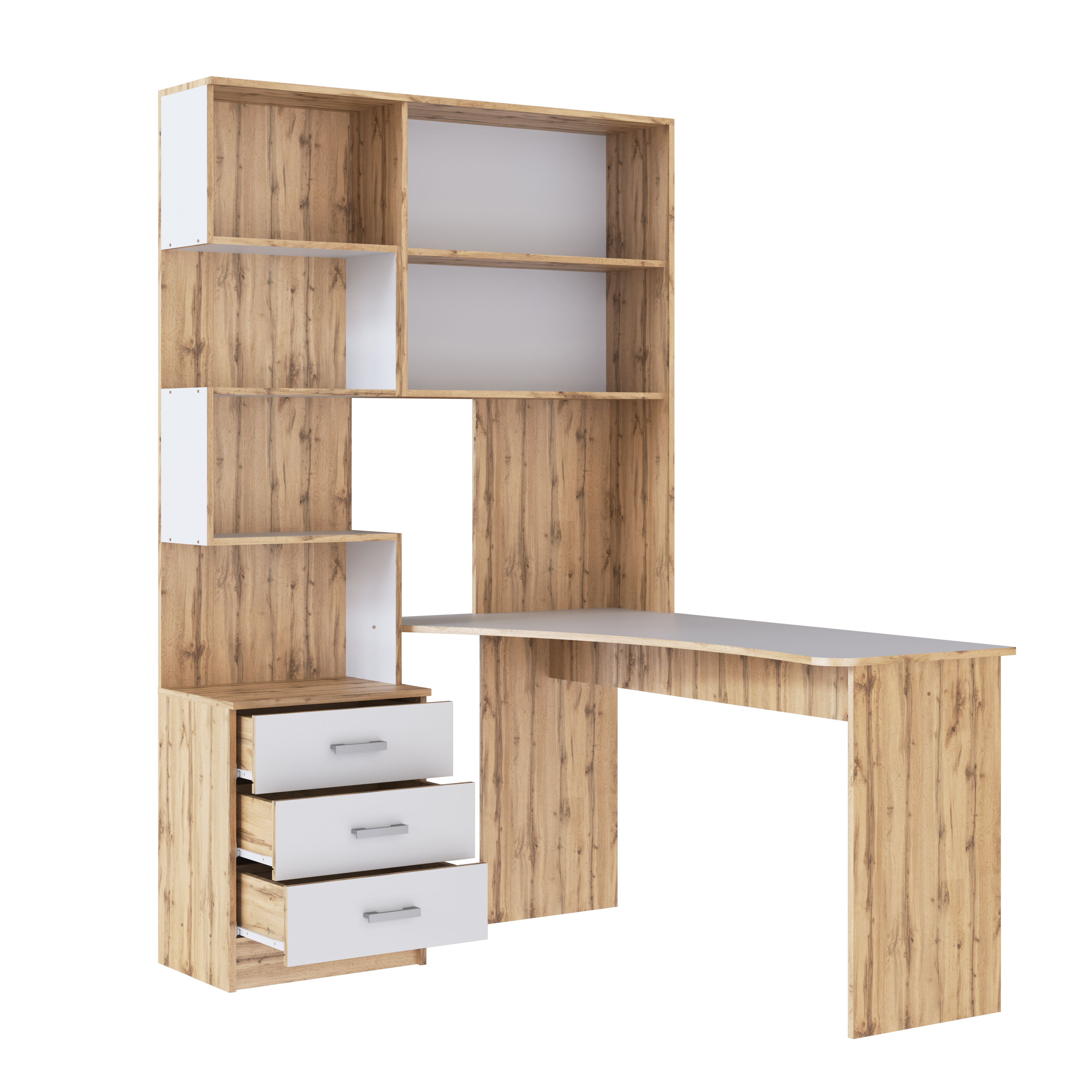 Удобный, вместительный компьютерный стол с эргономичным дизайном. Выдвижные ящики, закрытые полочки, открытые полочки и преимущество угловой сборки дают возможность разместить его в небольших помещениях. — Материал корпуса ЛДСП — Материал фасада ЛДСП — Роликовые направляющие — Петли без доводчиков — Сборка не универсальная (левый/правый по столу)