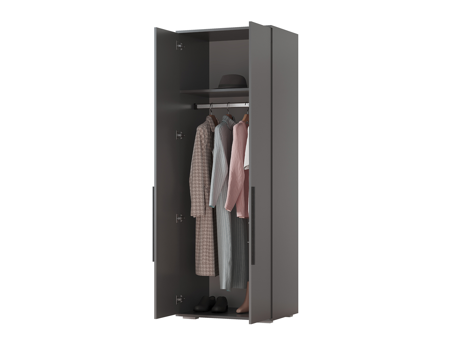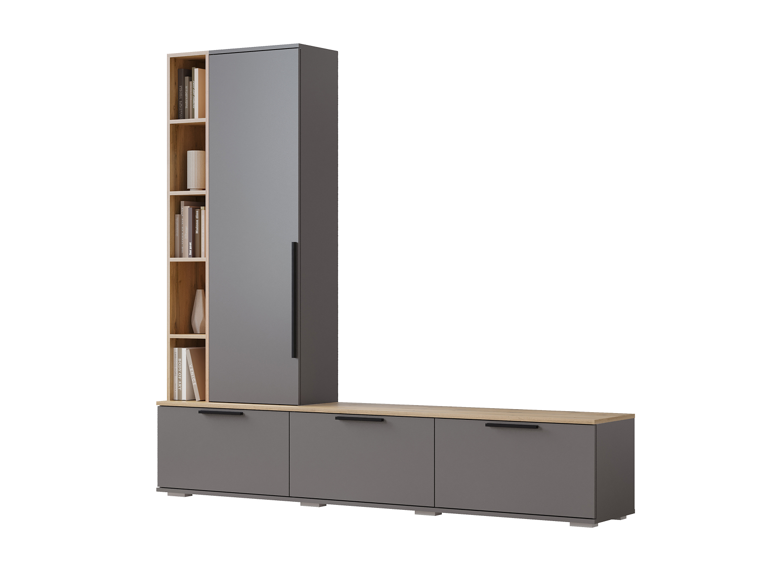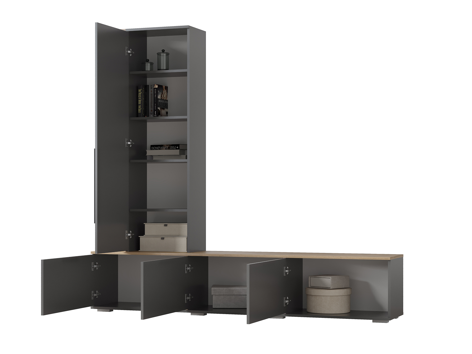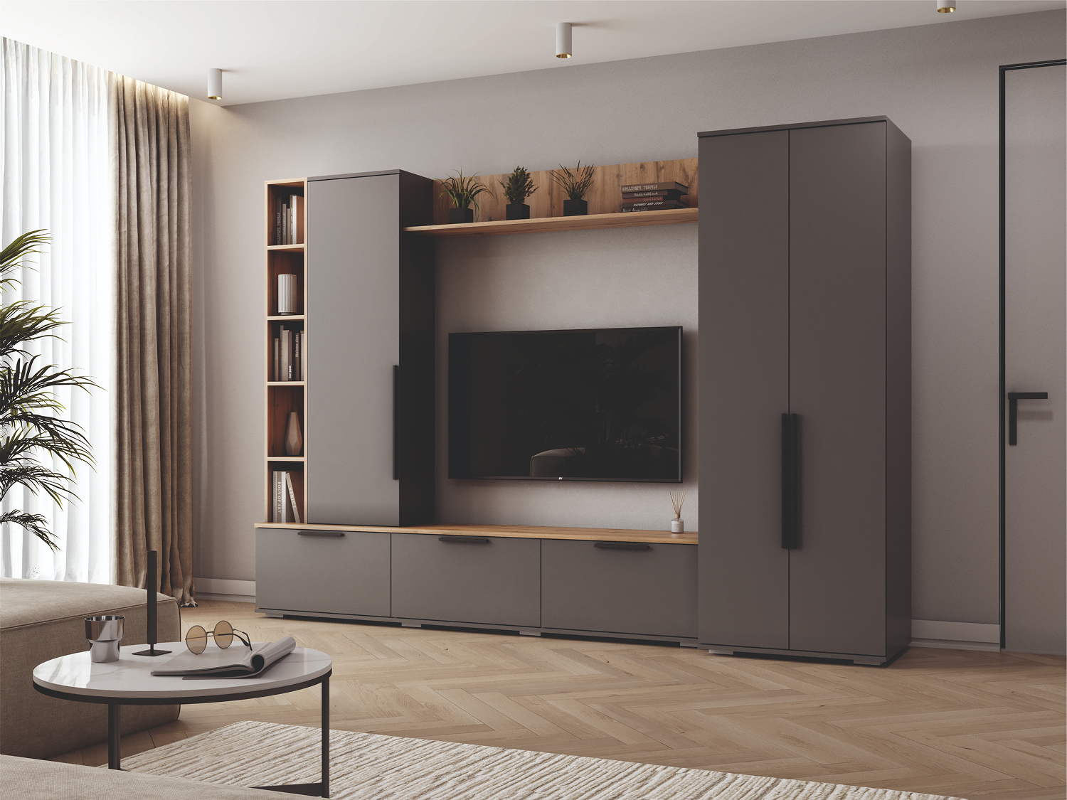 Модульная гостиная Селеста в минималистичном дизайне и спокойных цветах универсально впишется в дизайн любой гостиной. В гостиной предусмотрено множество мест для хранения вещей, предметов интерьера и одежды. Шкаф для одежды со штангой позаботиться о вещах, в тумбе удобно разместить книги, в шкафу-пенале одежду на полках, а на открытых полках — предметы интерьера или любимые фотографии. — Материал ЛДСП 16 мм — Петли накладные с доводчиком — Опора прямоугольная 20 мм пластик — Ручка металл — Сборка универсальная