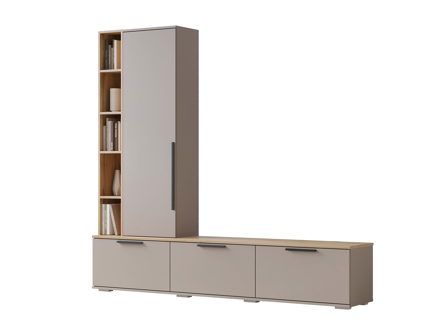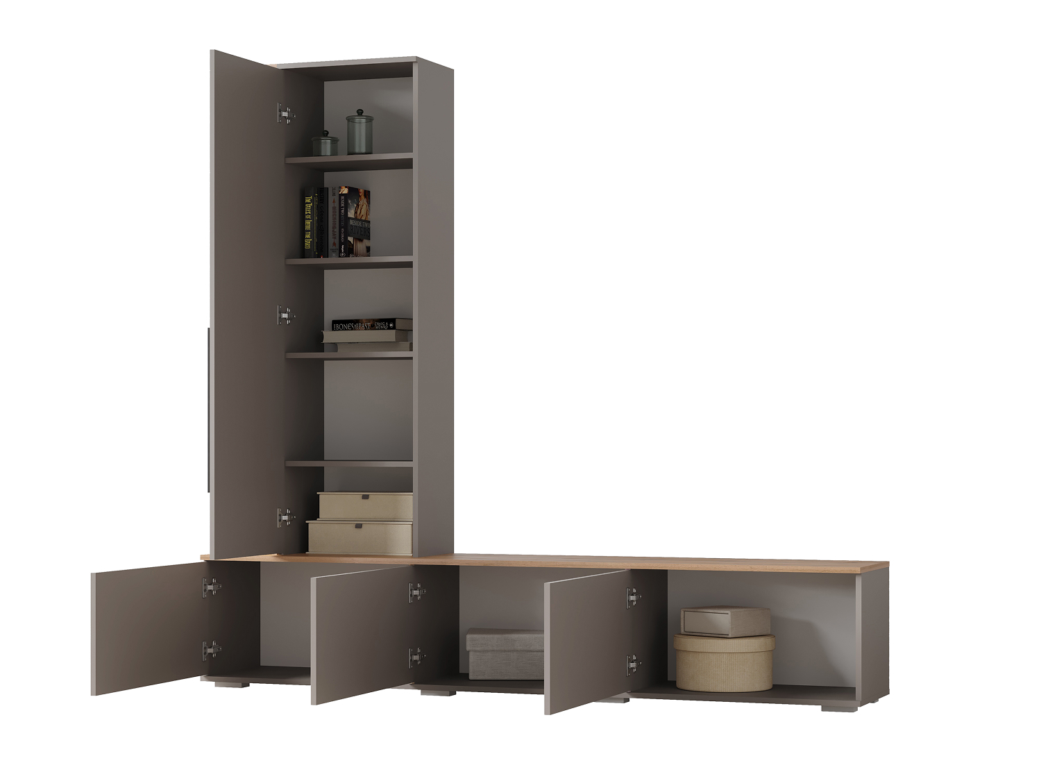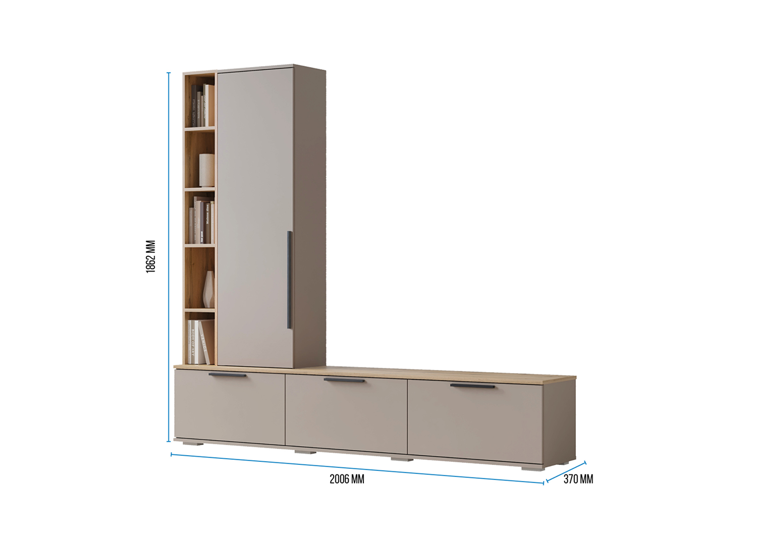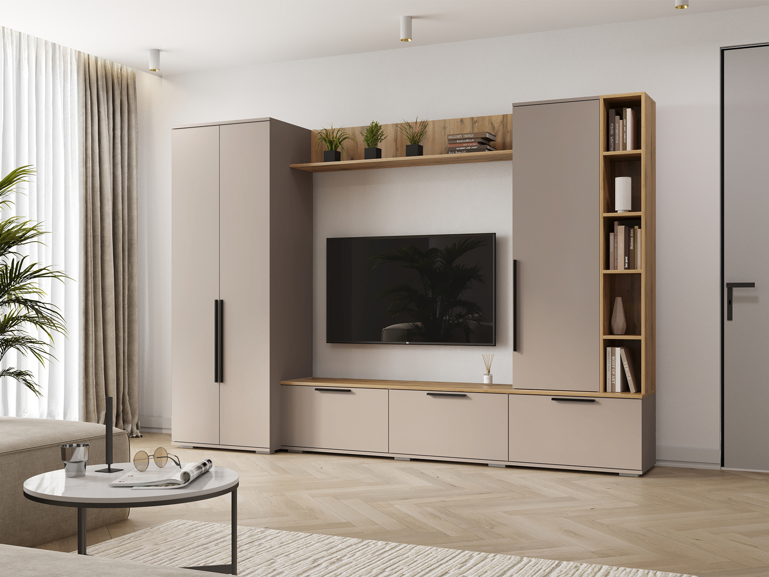Модульная гостиная Селеста в минималистичном дизайне и спокойных цветах универсально впишется в дизайн любой гостиной. В гостиной предусмотрено множество мест для хранения вещей, предметов интерьера и одежды. Шкаф для одежды со штангой позаботиться о вещах, в тумбе удобно разместить книги, в шкафу-пенале одежду на полках, а на открытых полках — предметы интерьера или любимые фотографии. — Материал ЛДСП 16 мм — Петли накладные с доводчиком — Опора прямоугольная 20 мм пластик — Ручка металл — Сборка универсальная